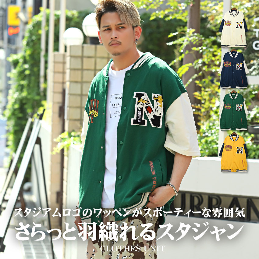 ▲送料無料▲ スタジャン メンズ アウター ストリート ルーズ ロゴ ワッペン サガラ刺繍 半袖