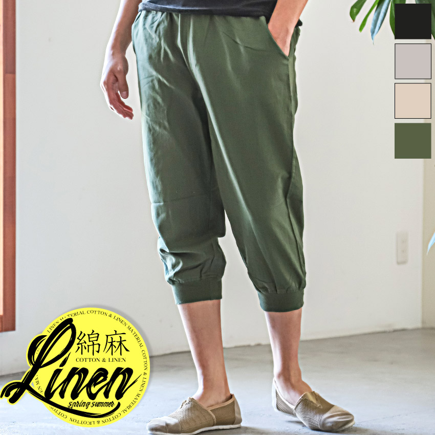 クロップドパンツ メンズ ボトムス ジョガーパンツ 綿麻 コットンリネン ストレッチ 7分丈 無地