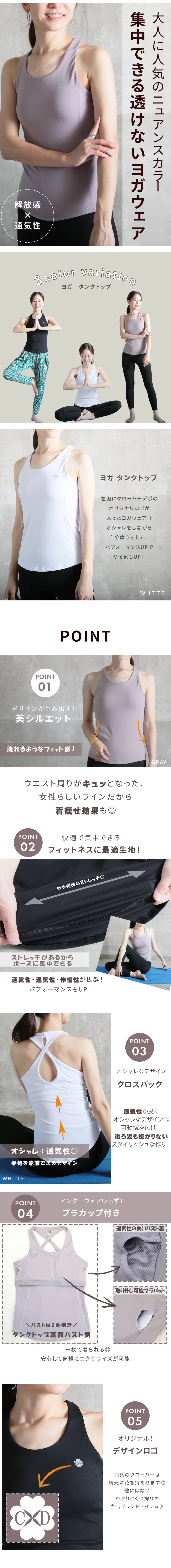 | ■スタッフによるおススメポイント | 体を動かしたい時に、 最適な ヨガウェア はこちらです! フィット感が魅力的なだけでなく、背中部分のクロスバックがオシャレで、自分磨きをしながらオシャレも楽しめます。 通気性・速乾性もばっちり。流れるようなフィット感で美シルエット!ブラカップ付きだから、安心して一枚で着られるのが嬉しい♪ |