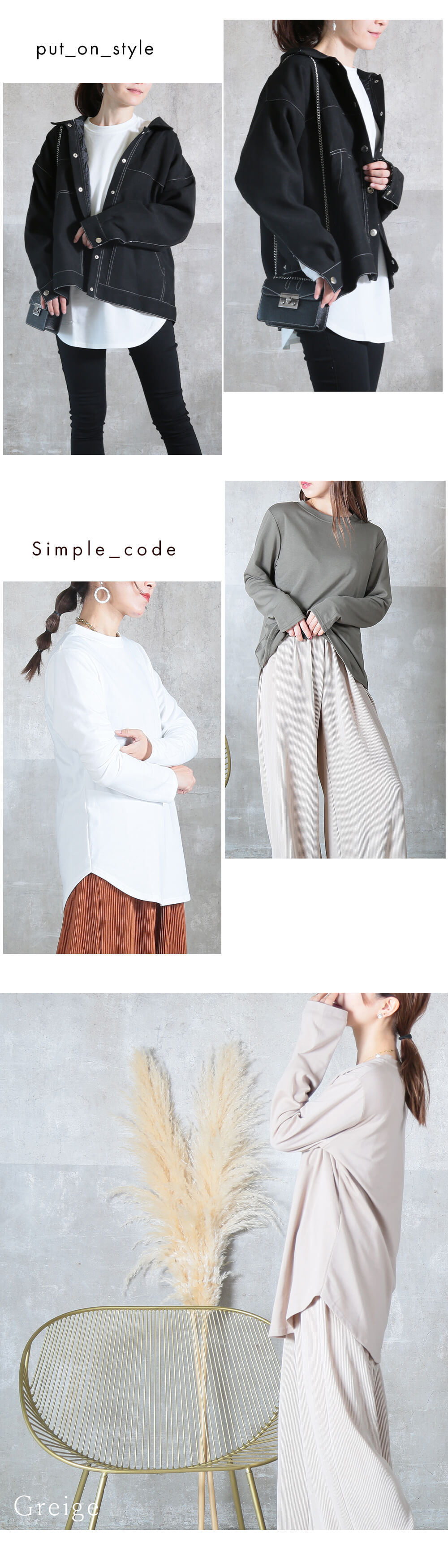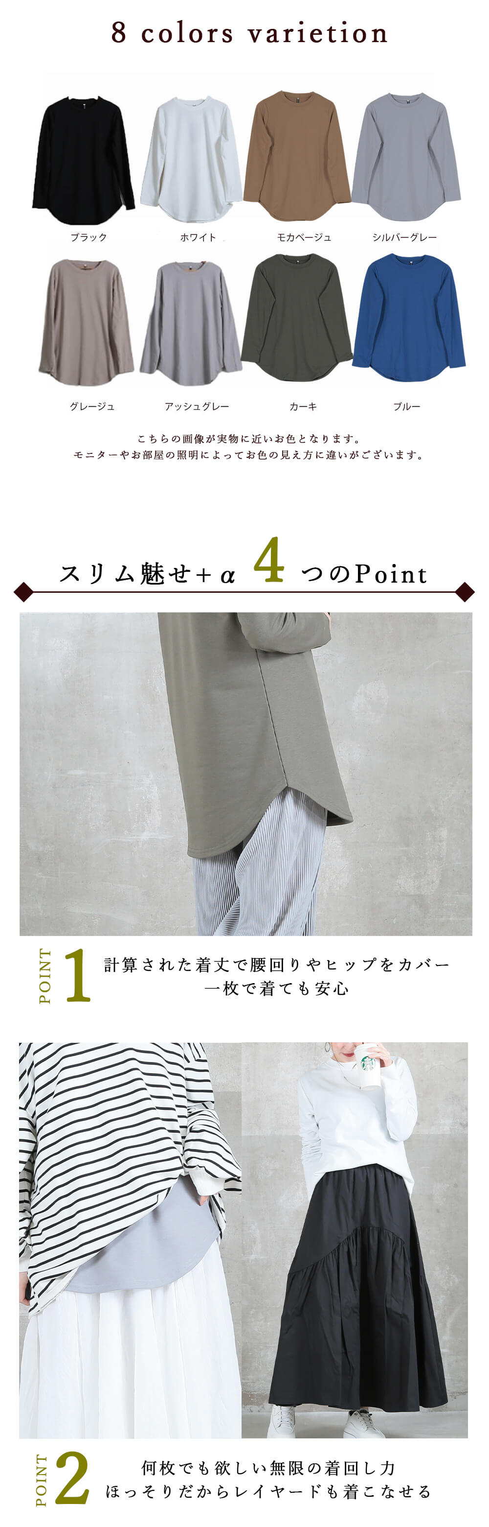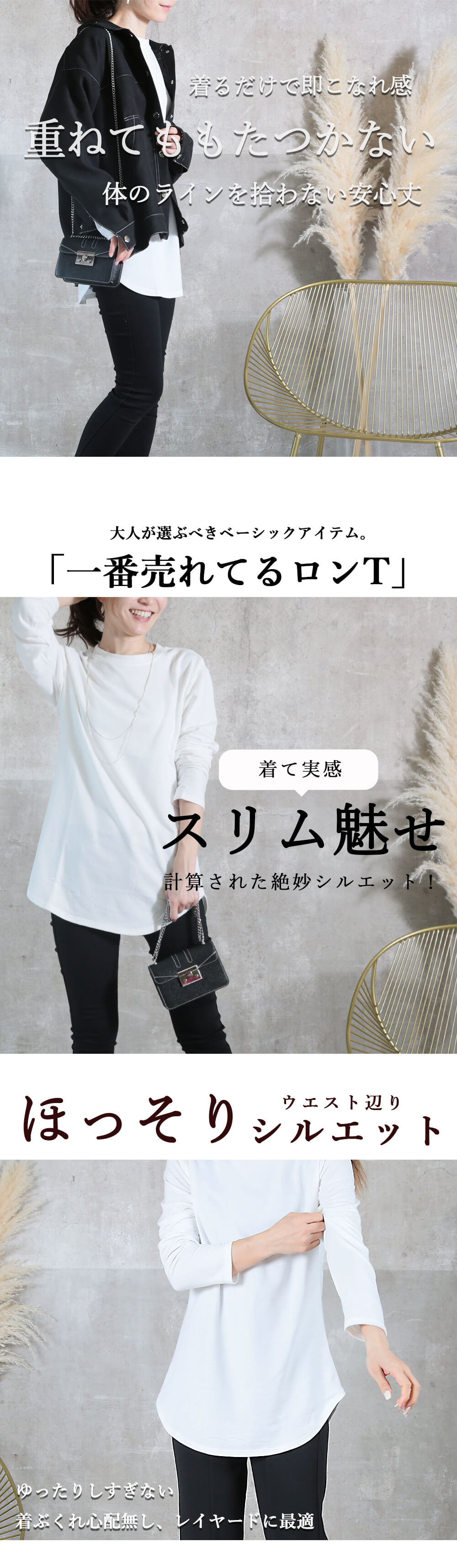 | ロングTシャツ,ロンT,長袖,カットソー,トップス,レイヤード,重ね着,ラウンドヘム,裾スリット,体型カバー,すっきり見え,大人カジュアル |