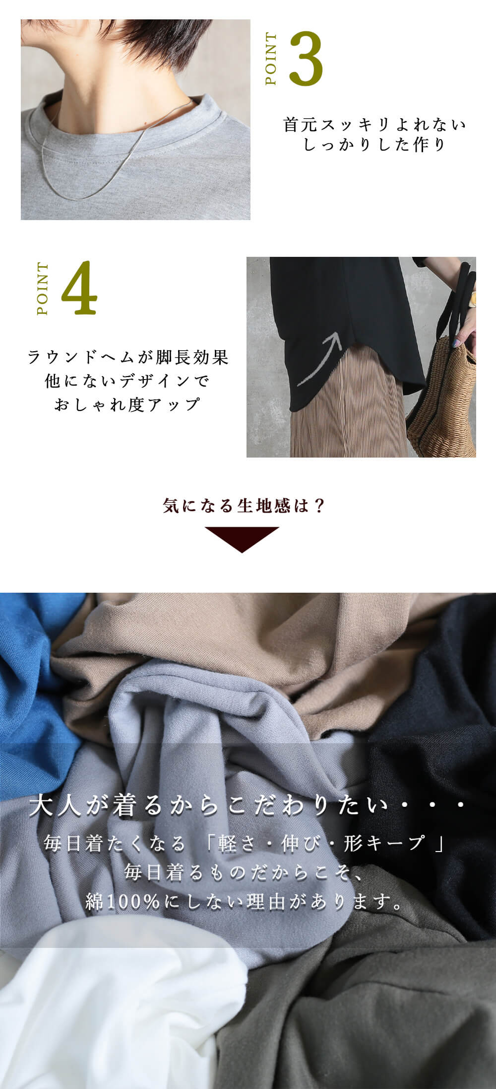 前後差のあるラウンドヘムが気になる部分をさりげなく包み込みます。
