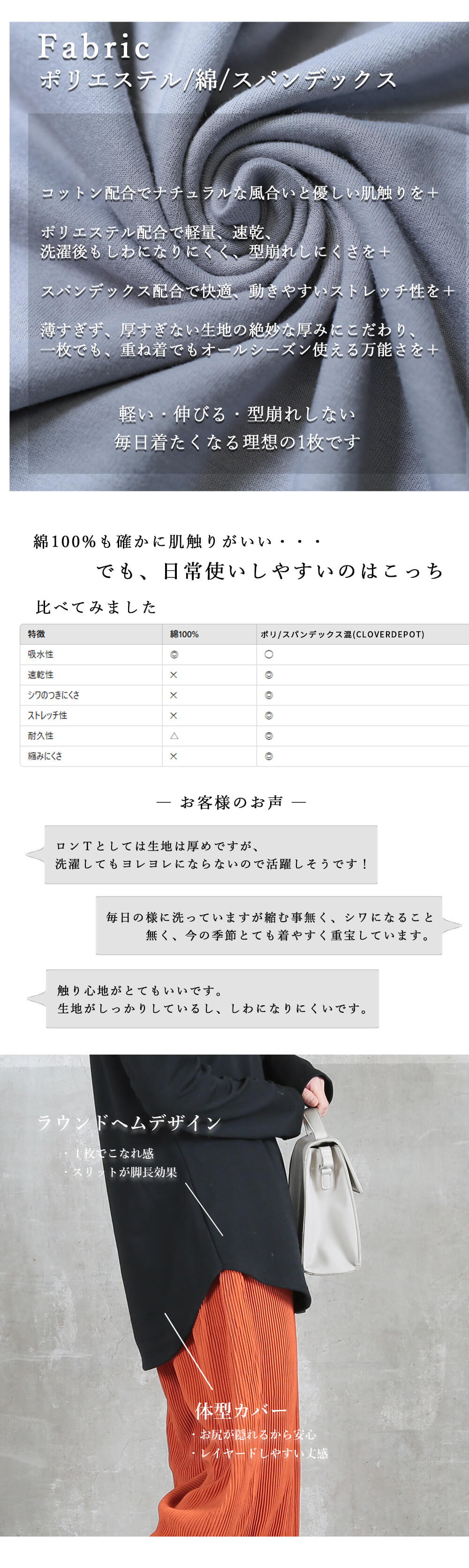 ロング丈×ラウンドヘムで腰回りもヒップも自然にカバーしながら、すっきり見えを叶えます。