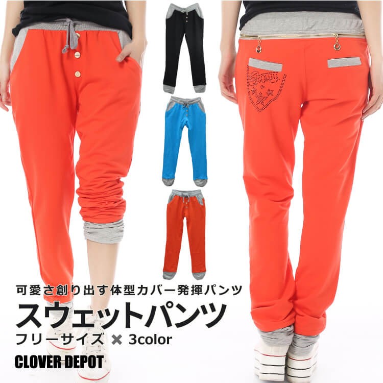スウェットパンツ レディース ゆったり スポーツ ダンス 美脚 ウエストゴム ポケット 10分丈 コーデ ジャージ ダンス ルームウェア 飾りボタン ストーン 黒