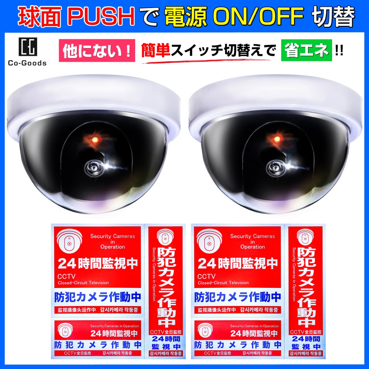 ダミー防犯カメラ (ON/OFF機能付 2個) 防犯ステッカー (防水 耐光 内貼1式 普通1式) 3M両面テープ8枚付属 監視カメラ ダミーカメラ