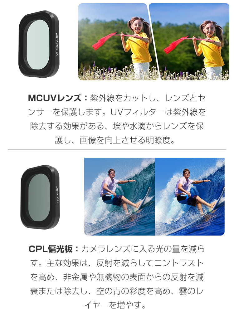 | 特徴 | 【対応機種】DJI Osmo Pocket 3専用のアクセサリー。 【品質な素材】フレームはアルミニウム合金製で、耐摩耗性と耐久性があり、独特の質感と操作性を実現。 【フィルターセット】フィルターセットには、CPLフィルター1つと一般的に使用される、MCUV、4つのNDフィルターが含まれています:ND8、ND16、ND32、ND64フィルター。 【HD光学ガラス】HD光学ガラスで作られたフィルターは強い光を遮断しながら鮮明な画像を提供します。CNC加工および研磨されたこのフィルターは、アクション カメラのレンズに完璧にフィットします。 【 男女兼用 ・高級感溢れ】シンプルで高級感溢れるデザイン、きれいなカラーは老若男女問わず、通勤・旅行・日常生活の様々なシーンに対応します。お友達や家族にもギフトとしておすすめます。 【商品品質】 商品の管理・品質については万全を期しておりますが、万一ご注文と異なる商品・不良品が届いた場合は 商品到着後7日以内にお問い合わせフォームにてお名前・受注番号などをご記入の上、ご連絡頂いた場合のみ対応となります。 | |||||