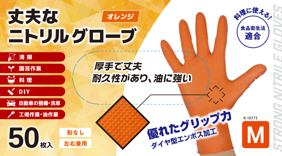 KK ニトリル手袋 50枚入 オレンジ M/L●厚手で丈夫なニトリルグローブです。エンボス加工で優れたグリップ力です。耐久性があり、油に強いので工事作業や油作業にも清掃、園芸作業、料理、DIY、自動車の整備・洗車など様々な場面に活躍します。カラーオレンジサイズM:全長:24cm/手のひらまわり:19cm/中指の長さ:7.7cmL:全長:24cm/手のひらまわり:21cm/中指の長さ:8.2cm材質ニトリルゴム生産国中国関連キーワード:掃除用品 清掃用品 園芸用品 ゴム手袋 厚手 食品衛生法適合