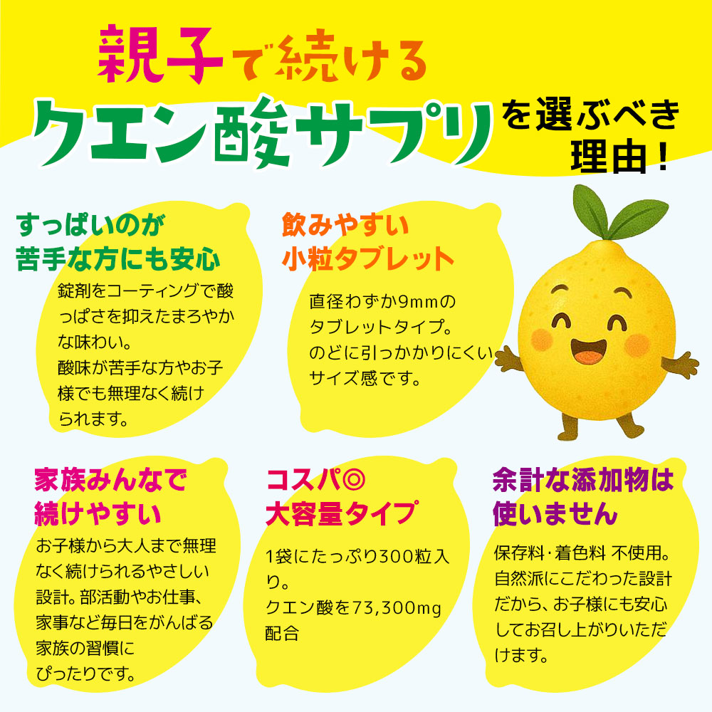 クエン酸 サプリ 親子で続ける 300粒 73,300mg 酸味を抑えた クエン酸 飲みやすい 子供 大人 サプリメント 60〜100日分 爆買い