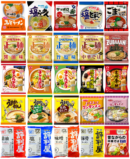 うまかっちゃん・サッポロ一番・チャルメラ・うまかっちゃん・チキンラーメン・出前一丁・評判屋・日清のラーメン屋さん等の中から12種類をランダムにセレクトいたします。