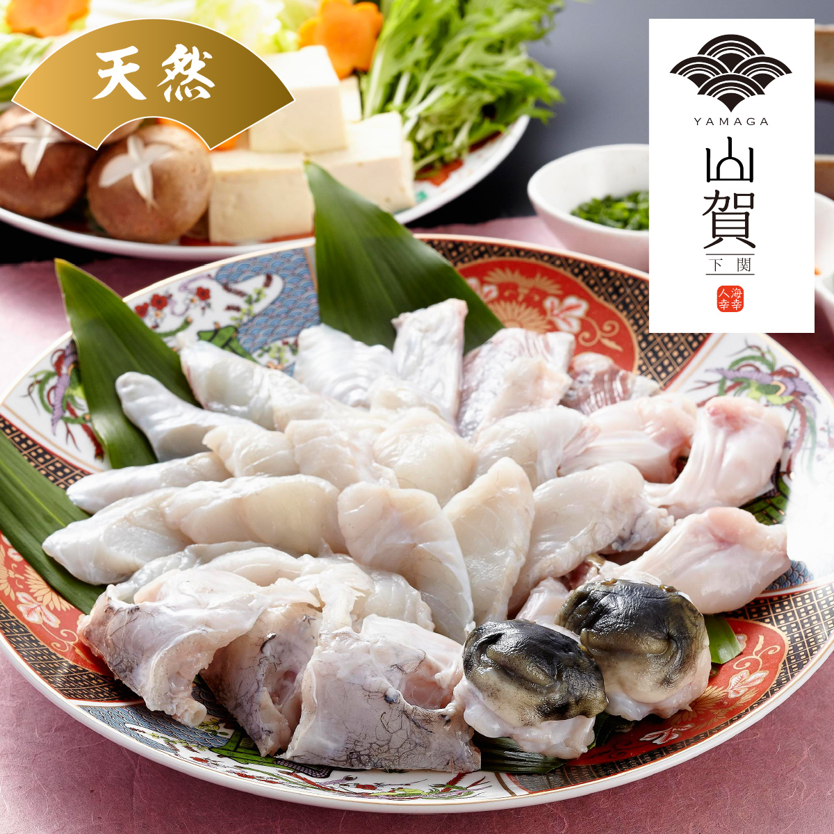 山賀の職人の目利きで選んだ 2kg から 3kg サイズの国産天然トラフグに、弊社社長が自ら包丁を入れ、身質の確 認をした厳選素材だけをちり鍋セットにしました。ふぐ料理