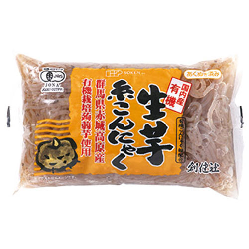 ●群馬県赤城高原産の有機栽培蒟蒻芋を使用し、有機認証の製造工場(登録認定機関:共にJONA)で製造した、有機生芋糸こんにゃくです。