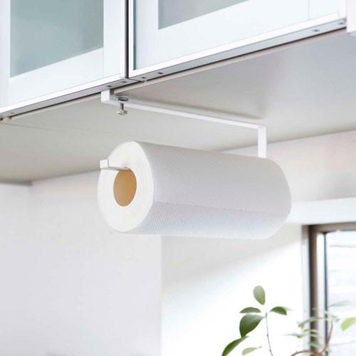 シンク・コンロ上の棚板に挟んで固定する、キッチンペーパーホルダーです。一般的なサイズの直径11×高さ24cmまでのサイズに対応。付属の固定ネジを締めるだけでOK!穴あけ不要で賃貸の方もお使いいただけます。戸棚下のデッドスペースを有効活用して、がさばりがちなキッチンペーパーをスッキリ収納してみませんか?