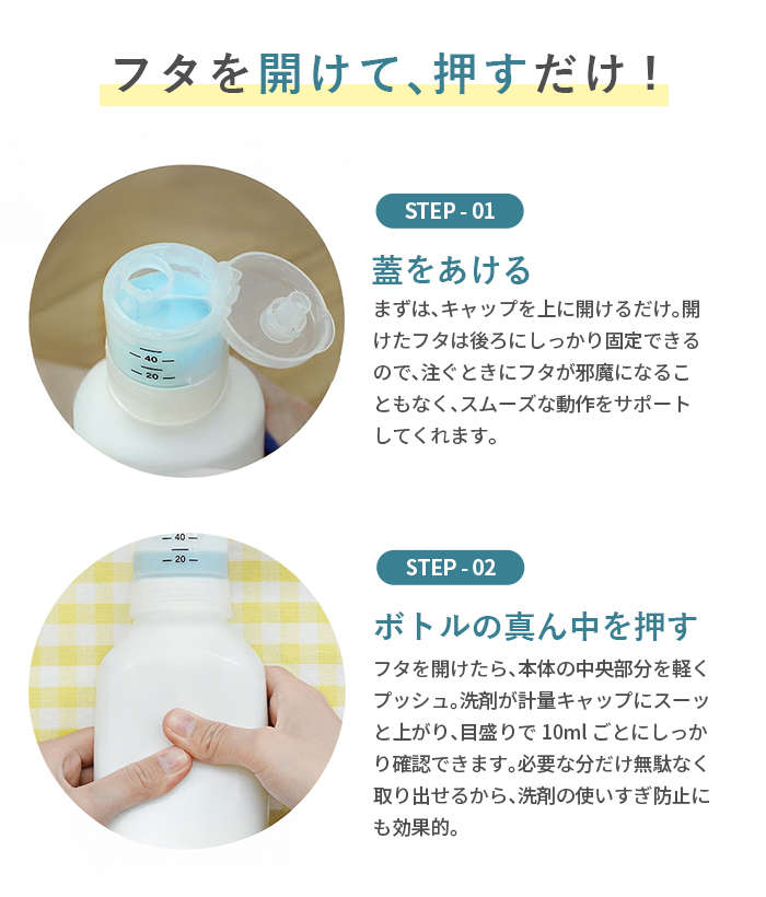軽く押すだけで10ml単位の洗剤が簡単に量れます。