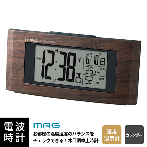 デジタル アラームクロック 電波式 目覚まし時計 ノア MAG マグ ウッドライン T-743 ブラウン木目 温湿度表示