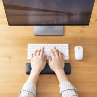 腕や肩の疲れを軽減するやわらか低反発ウレタン内蔵リストレスト。W300mm・抗菌。