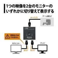 ボタンひとつで家庭用ゲーム機や映像機器、パソコンなど、1つの映像を2台のモニターのいずれかに切り替えて表示したり、2つの映像のいずれかを1台のモニターへ表示することができます。