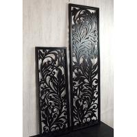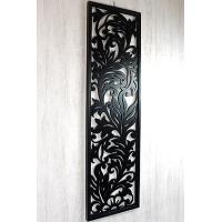 長方形の中に流れるように植物がデザインされた、木製アートパネルです。一枚の板にデザインを描き、糸ノコなどで彫刻していく技術のいる作品です。