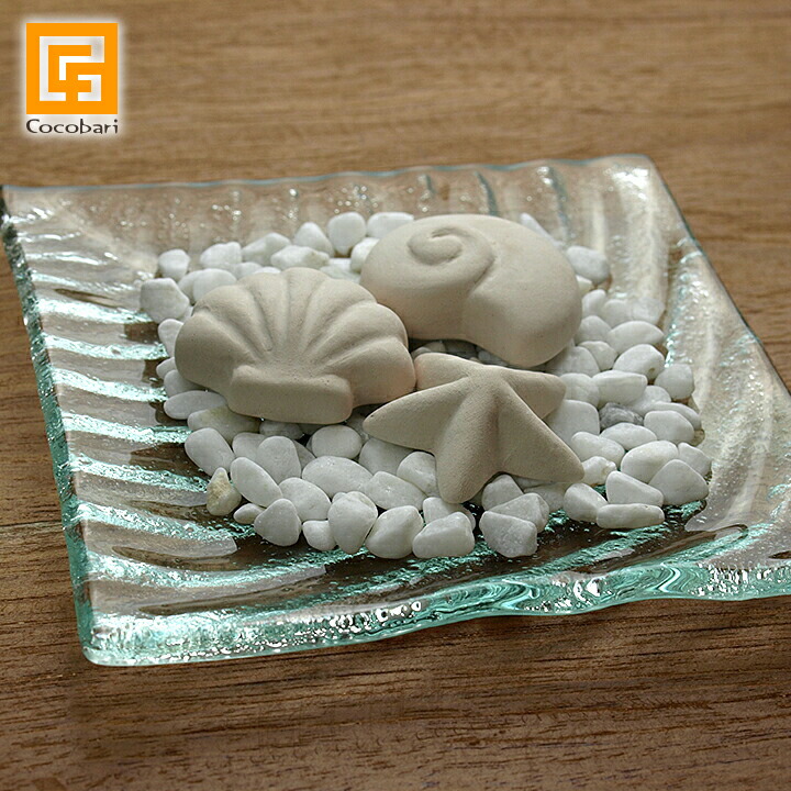 デザインは夏にぴったりのビーチリゾートのイメージです。 波打ち際の水面を思わせるマリンブルーのガラスプレートに、貝とヒトデとナチュラルストーン(小石)をセットにしました。
