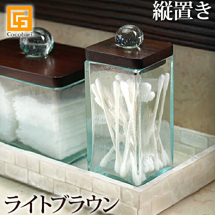 ガラスと木(チーク)を組み合わせたコットンケースはほっとする優しい佇まいで、バリを思わせます。毎日使うアメニティグッズや髪留め、シュシュなどのアクセサリーを収納すれば、洗面所で、極上リゾートホテルの非日常感が味わえます。