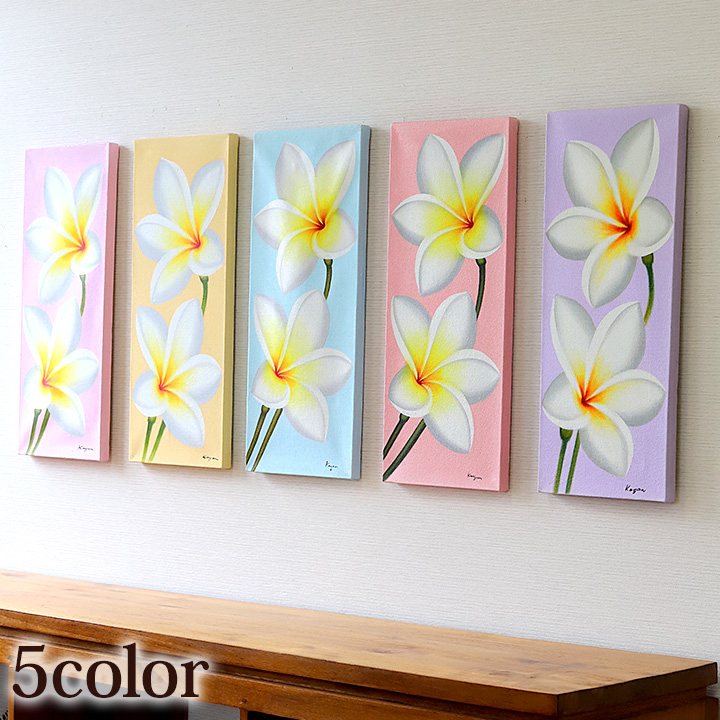 広い壁に飾る場合は、1枚より3枚並べて飾るとバランスがいいです。カラフルで華やかな空間に♪どの組み合わせでも色彩のトーンが合っているのと、白いプルメリアで統一されているので、一体感が感じられます。 左から「ベビーピンク」「クリーム」「ライトブルー」です。