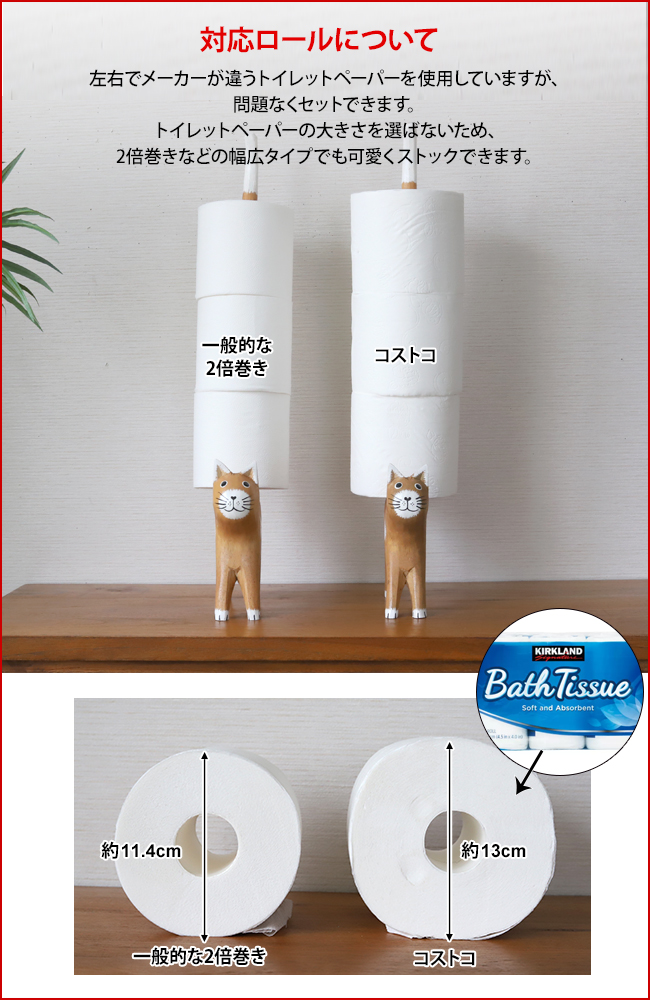 トイレットペーパーは最大3つまで入ります。猫は木製で軽ため、トイレットペーパーを取ったり入れする際は猫が倒れないように体をおさえて行ってください。