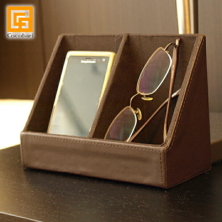 手触りもなめらかなフェイクレザー製フェイクレザー(合皮)製のスマホ&メガネホルダーです。開口部が広いので、スマホやリモコンが出し入れしやすいです。
