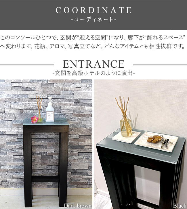 玄関のような狭い場所にも置けます。リードディフューザー、手の消毒液、鍵トレイなどを置くのに丁度いいサイズ。