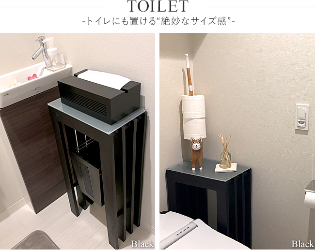 スリムなのでトイレにも置いていただけます。天板はガラスなので、水がかかっても安心です。ご家庭では芳香剤やトイレットペーパー、ペーパータオルなどを置いてください。このサイドテーブルなら好きな位置に置くことができるのでおすすめです。