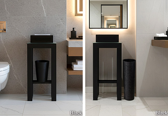 ブラックカラーのラタン製ダストボックス「Dustbox Luxury Black Rattan」とのコーディネート。バリ島の伝統技術とモダンな素材が融合した、当店オリジナルのダストボックスです。