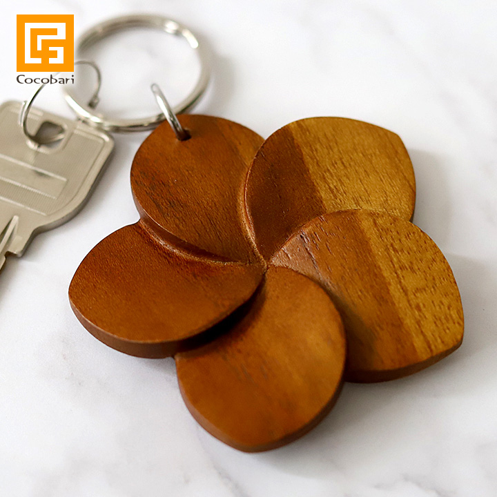 バリを代表するお花「プルメリア」のモチーフの木製キーリングです。 材質は高級家具で使われるチーク材。丈夫で、耐水性に優れています。