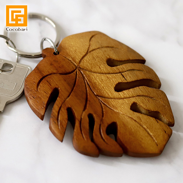 観葉植物で人気の「モンステラ」のモチーフの木製キーリングです。材質は高級家具で使われるチーク材。丈夫で、耐水性に優れています。