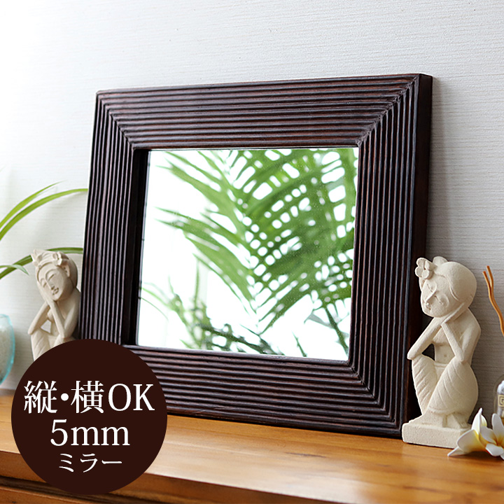こちらのミラーはバリで手に入る最高ランクのミラー(厚みが5mmのもの)を使っています。通常安価なミラーは3mmタイプですが、サイズが大きくなるとゆがみが生じることがあります。グレードが上がる分、お値段も少し上がりますが、5mmタイプの方がより正確に映る鏡であると言えます。