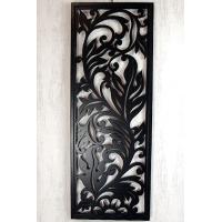 長方形の中に流れるように植物がデザインされた、木製アートパネルです。一枚の板にデザインを描き、糸ノコなどで彫刻していく技術のいる作品です。