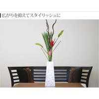 狭い場所などあまり造花が広がって欲しくない場合にも、上に細くなる台形のベースは収まりが良いです。直線的なリーフでスタイリッシュにアレンジすることができます。(リーフがまっすぐ立つように中に丸めた紙などを入れて隙間を埋めてください)