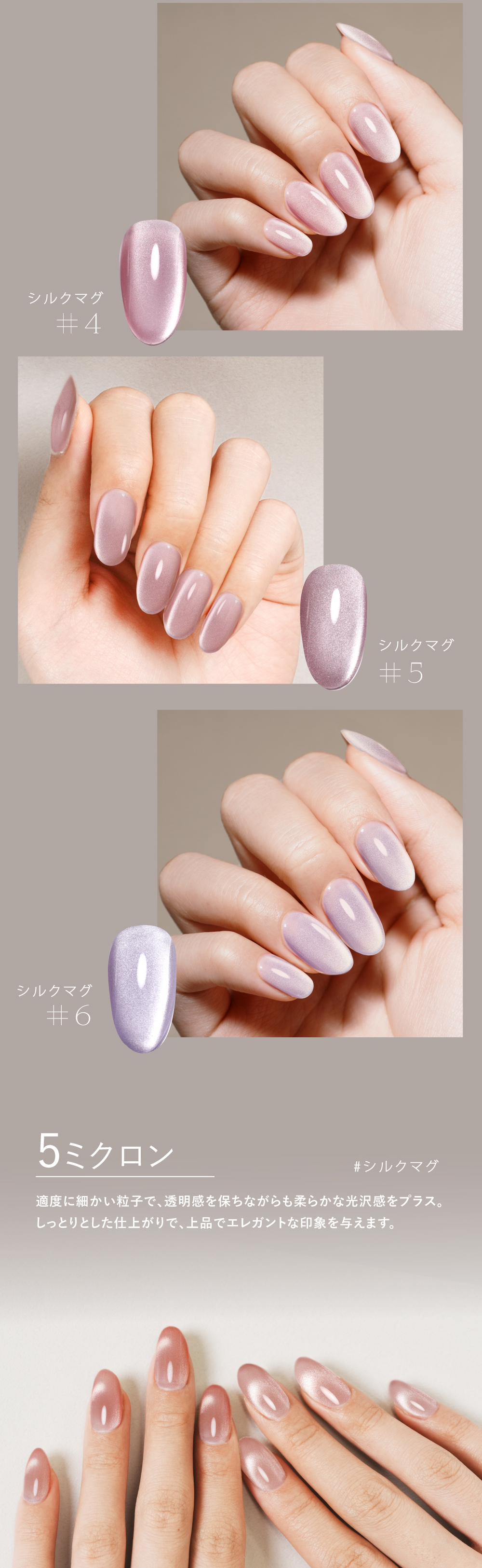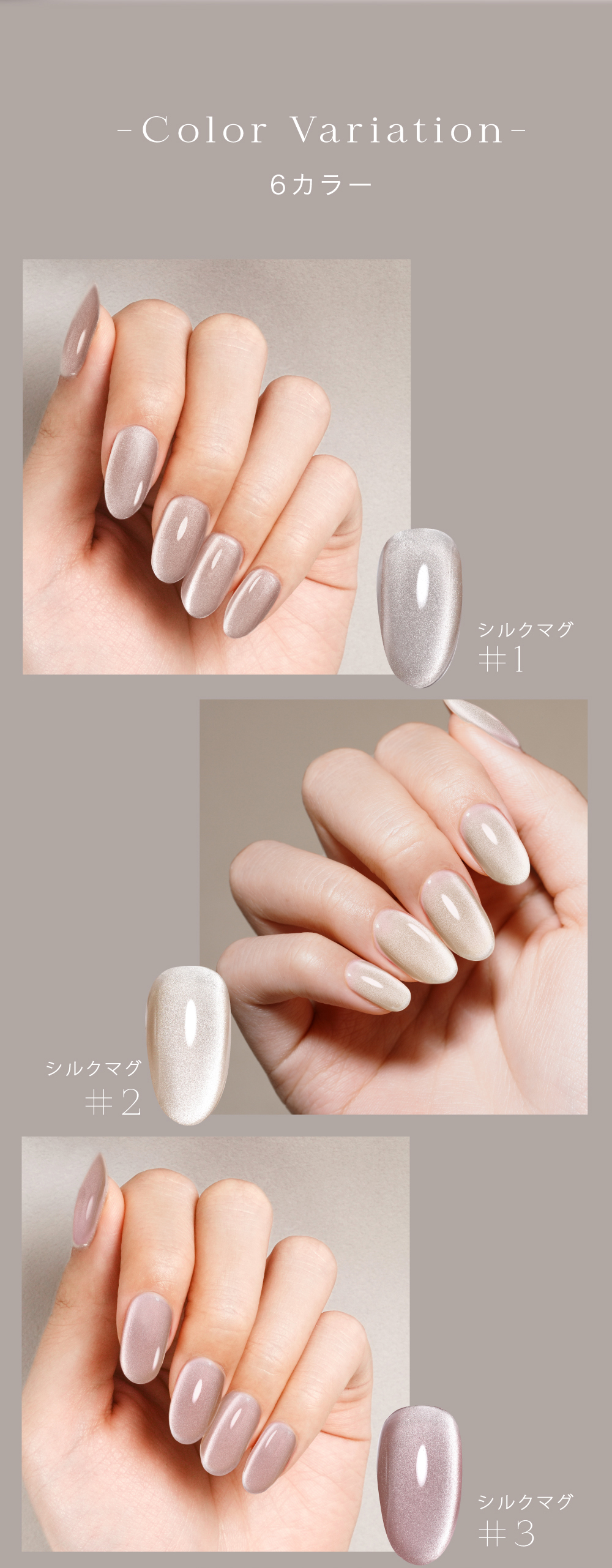 各色は独自の魅力を放ち、光の角度によって異なる表情を見せるため、日常使いから特別なイベントまで、あらゆるシーンで活躍します。マグネット効果により、独特の模様やデザインが簡単に作れるため、セルフネイルがより楽しく、創造的なものになります。