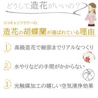 ココキャンフラワーのインパクトのある 光触媒 胡蝶蘭 3本立ち。根の動きまでこだわって仕上げていますので、ボリュームや完成度にもご納得いただけることと思います。花の色が9色から選べる豊富なラインアップも当店の特徴です。