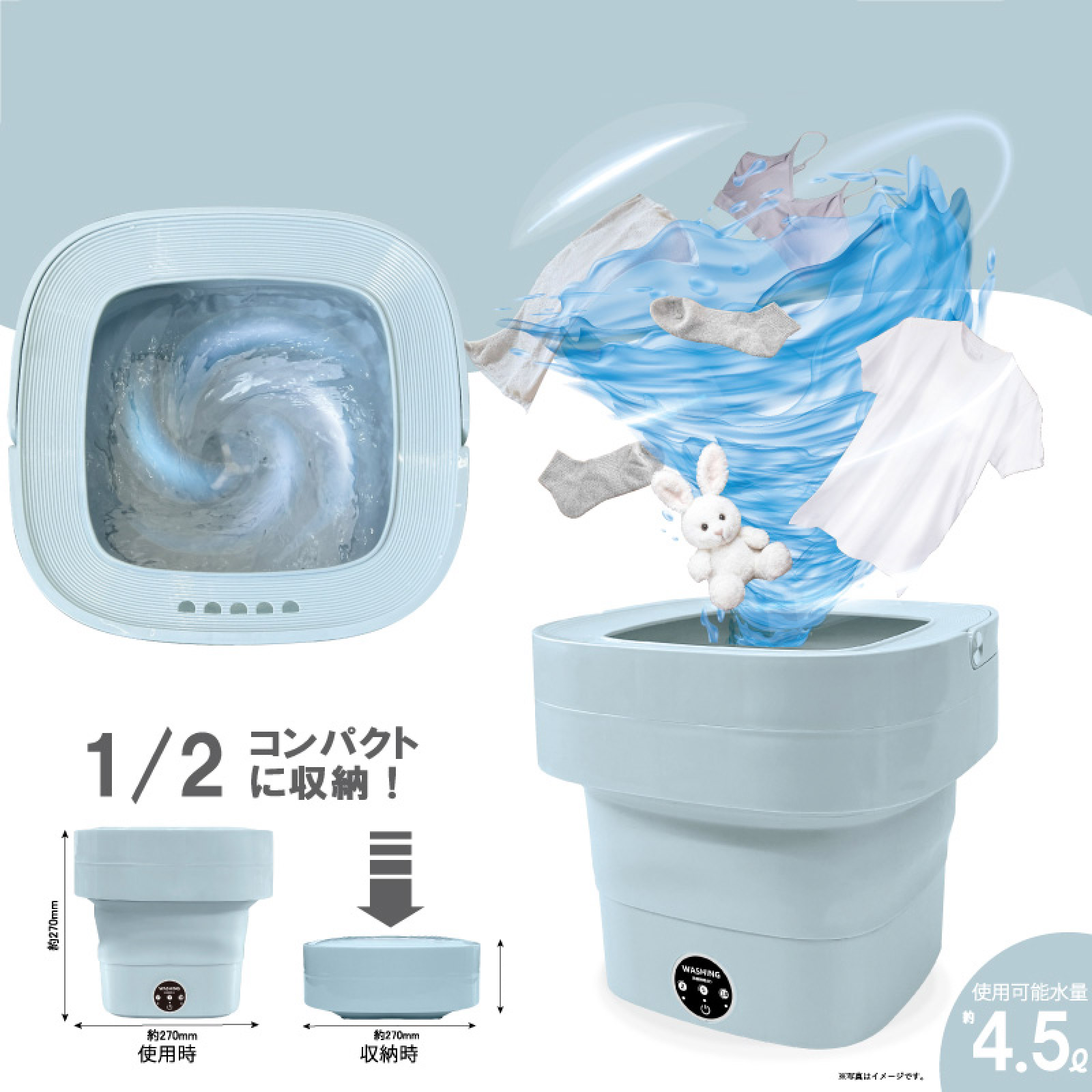 パワフル水流で洗える折りたたみ式ミニ洗濯機です。