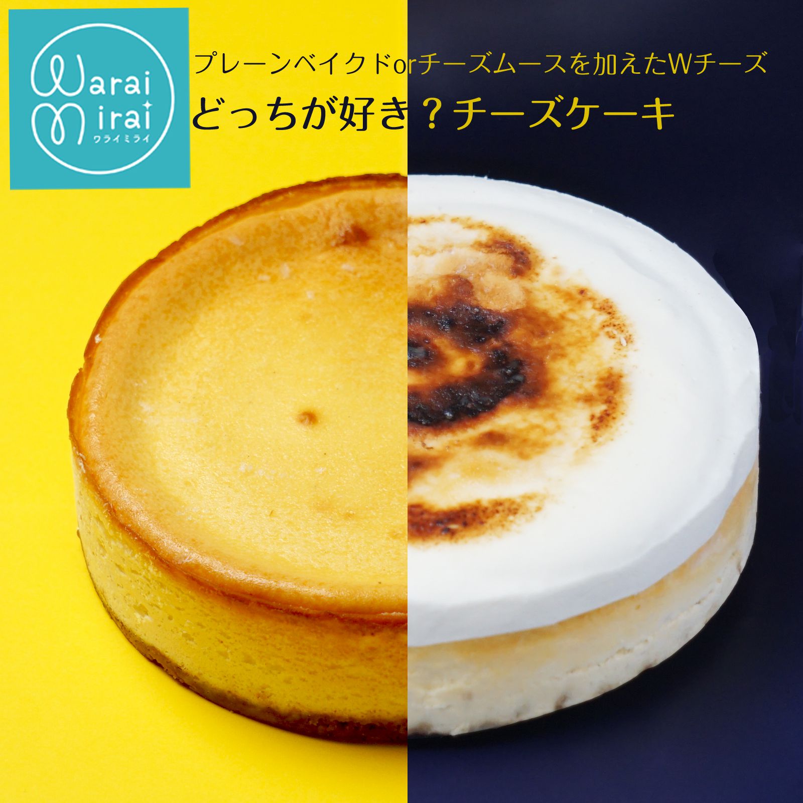 | わらいみらいの自信作、どっちを選ぶかホントに迷う2種類のチーズケーキができました 1種類目:ザ・チーズケーキ、シンプルゆえにダイレクトに伝わる「濃厚」なベイクドチーズ 見た目は超シンプルがゆえに味で勝負しています。このチーズケーキをあなどるなかれ、一度食べたらその良さがわかる 濃厚でしっとりのチーズケーキは、じっくりと時間をかけて、1つずつパティシエが手作業で焼き上げています 食べ応え十分のチーズケーキながら、トンカ豆やバニラで上品な香りがあり、重みがありながら次々に食べられる 2種類目:1種類目のベイクドチーズケーキの上に、クリームチーズムースを乗せたダブルチーズケーキ 濃厚なチーズケーキの上に、口どけなめらかなムースを乗せることで、軽い食感へと様変わり さらにキャラメリゼをされている場所とされていない場所でも味が変わる、1度で2度おいしい欲張りなケーキ どっちを選べばいいのか、スタッフ間でも意見が割れるし、その日の気分によっても変わる サイズもそれぞれの味で4号5号で2種類あります 4号は4〜6カット、2〜3人用が目安に。5号は6〜8カット、3〜6人用が目安になります。(写真はすべて5号サイズ) 化粧箱に入れて配送します、ギフトにももちろん自分用にもぜひ贅沢を味わってほしい 冷凍で配送します。冷蔵庫で解凍してから、もしくは半解凍の状態でお召し上がりください |