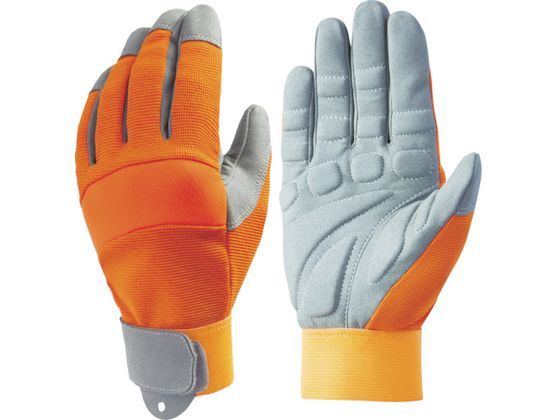【商品説明】●振動工具などの作業による振動を軽減し、手を守ります。●手のひらに振動軽減パッド、甲はSBRゴムを使用したナックルガード付きです。●ミクロ繊維技術と精密加工によって作られた、天然皮革に負けないソフトな質感と優れた耐久性です。●ソフト高耐久人工皮革を使用し、摩擦に強いです。●SBRゴムで手が曲げやすいです。【仕様】●型番:7738 ●色:オレンジ ●サイズ:L ●厚さ(mm):1.4 ●全長(cm):22.5 ●手のひら周り(cm):22.6 ●中指長さ(cm):8.0 ●カラビナ通し穴付 ●袖口:マジック式 ●手のひら部:人工皮革、振動軽減パッド ●手甲部:ポリエステル ●鋭利な刃物・高温物を直接掴まないでください。 ●絶縁性はありません。