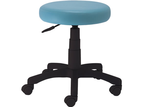 【仕様】座面が水拭きできるPVCレザー張り。座面直径390mmのゆったりサイズのラウンドチェア。●外寸法:幅535×奥行510×高さ425mm●座面高さ:425〜555mm●座面寸法:幅390×奥行390mm●材質:座/(張り地)PVCレザー(中身)ウレタンフォーム、本体・脚・キャスター/ナイロン●質量:5.2kg●昇降方式:ガス圧式●カラー:ブルー●組立人数:1人●組立時間:5分●生産国:中国●注文単位:1脚