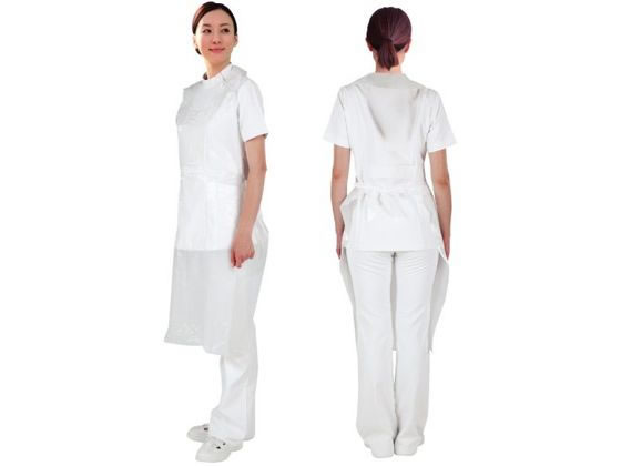 【商品説明】●袖なしタイプ ●バリア性が高く、焼却時に有害物質の出ないポリエチレン製 ●血液や薬液などの飛散から着用者を保護 ●緊急時の着脱が容易になる、静電気防止加工済み【仕様】●カラー:ホワイト ●サイズ:フリー ●長さ:117cm●幅:71cm●首回り横:22cm●首回り縦:20cm ●入数:50枚/箱 ●未滅菌