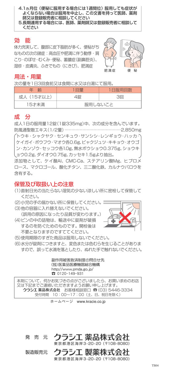 体力充実して、腹部に皮下脂肪が多く、便秘がちなものの次の諸症:高血圧や肥満に伴う動悸・肩こり・のぼせ・むくみ・便秘、蓄膿症(副鼻腔炎)、湿疹・皮膚炎、ふきでもの(にきび)、肥満症