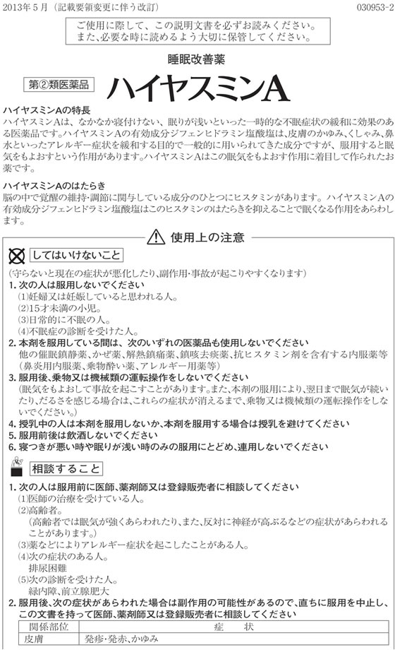 ハイヤスミンAは、なかなか寝付けない、眠りが浅いといった一時的な不眠症状の緩和に効果のある医薬品です。ハイヤスミンAの有効成分ジフェンヒドラミン塩酸塩は、皮膚のかゆみ、くしゃみ、鼻水といったアレルギー症状を緩和する目的で一般的に用いられてきた成分ですが、服用すると眠気をもよおすという作用があります。ハイヤスミンAはこの眠気をもよおす作用に着目して作られたお薬です。