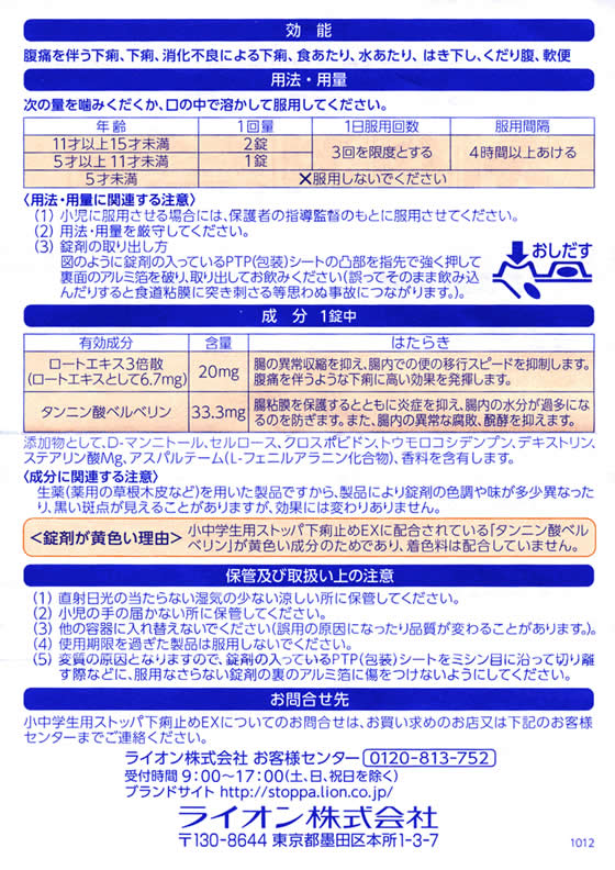 生薬ロートコンから抽出したロートエキスが、腸の異常収縮を抑え、腸内での便の移行スピードを抑えます。さらに、タンニン酸ベルベリンが腸粘膜の炎症を抑えるとともに下痢の原因菌を殺菌し、食あたり・水あたり等の下痢に効果を発揮します。