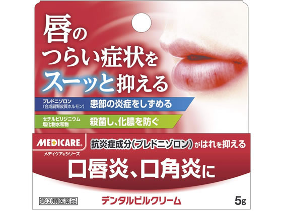 ◆デンタルピルクリームは、抗炎症作用のある合成副腎皮質ホルモン・プレドニゾロンと、細菌感染を防ぐ殺菌成分・セチルピリジニウム塩化物水和物を効果的に配合しており、口唇炎、口角炎などに優れた効果をあらわします。