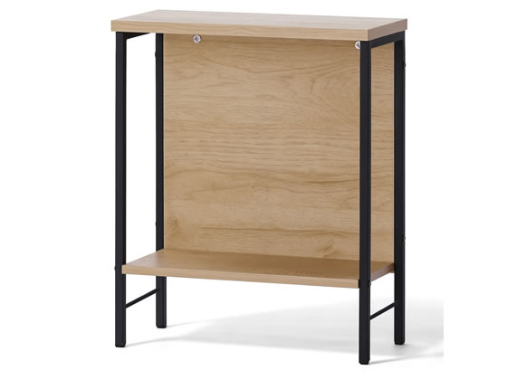 【商品説明】約18cmの奥行きスリムな設計で空間を広く使えます。 ブラックスチールとあたたかな木目調の木材の組み合わせで、スタイリッシュなお部屋を演出します。 本や小物などが収納できる棚板付きです。 背板があるため書籍も置けます。 背板があるため設置場所に応じて、外側からは見えにくく、使用面はオープンで使いやすくなっています。 ベッドサイドやソファ横、玄関など場所を選ばずお使いいただけます。【仕様】●カラー:ナチュラル/ブラック ●商品サイズ:約幅395×奥行180×高さ480mm ●商品重量:約3.05kg ●耐荷重:全体約15kg、天板約10kg、棚板約5kg ●天板サイズ:約395×180mm ●棚板サイズ:約364×163mm ●天板下から棚板までの高さ:約343mm ●棚板下から床までの高さ:約108mm ●主要材質:木製部分/プリント紙化粧パーティクルボード、パイプ部品/金属(鋼)(エポキシ樹脂塗装)