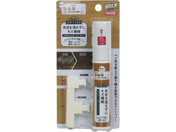 【商品説明】●木材(フローリング、窓枠など)のすりキズ、ひっかけキズ、色あせ等に塗るだけで目立たなくします。●付属のペン先を変えて塗り幅を変更できます。●床暖房対応のフローリングにも使用できます。※木部専用となります。【仕様】●成分:イオン交換水、アクリル樹脂、アルコール、着色剤、添加剤●容量:20ml●付属品:ペン替え芯大・小(淡黄色)、液漏れ防止用ペン芯(白色)●乾燥時間:約3時間●ライトブラウン〜ブラウン色の木部用 hikkoshi_4