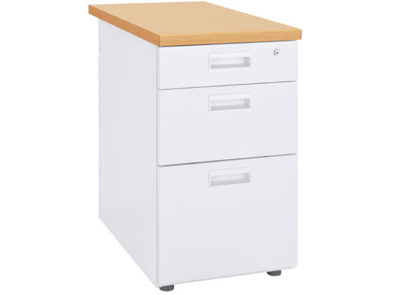 【商品説明】一台で作業スペースと収納スペースを同時に拡張できるため、急なオフィスの拡張や、増えすぎた書類の整理にオススメです。セキュリティもしっかり対策できて一箇所の鍵(カギ)で、引き出しの集中管理が可能です。中段と下段には、仕切り板が一枚ずつ付いていますので、ファイルなどを見やすく分類収納することができます。【仕様】●外寸法:幅400×奥行700×高さ700mm●天板厚さ:30mm●引出内寸法:(上段)幅318×奥行420×高さ97mm(中段)幅318×奥行420×高さ186mm(下段)幅318×奥行486×高さ285mm●材質:天板/高圧メラミン樹脂ポストフォーム加工、幕板・引出/スチール、アジャスター/ABS●質量:23.9kg●引出レール仕様:ダブルサスペンション(下段のみ)●引出ロック方法:オールロック機能●カラー:ナチュラル●付属品:仕切板/中段用1枚・下段用1枚、鍵2本●必要工具:プラスドライバー●組立人数:1人●組立時間:15分●生産国:中国●注文単位:1台