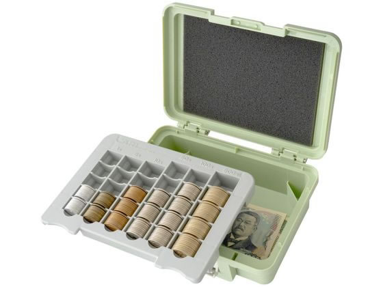【商品説明】金銭の管理、保管に便利な手提げ金庫です。本体は軽くて取り扱いやすいプラスチック製で、持ち運びに便利なハンドル付きです。コイントレー付きで6金種各50枚収納でき、トレー下は紙幣やマイナンバーカードが収納できます。上蓋の裏側にあるクッションで硬貨を抑え込むので、持ち運び時に生じる硬貨の飛散を防止します。【仕様】●外寸サイズ:幅201×奥行150×高さ73mm●内寸サイズ:幅176×奥行82×高さ30mm●重量:370g●材質:プラスチック、金属●色:ライトグリーン●硬貨飛散防止機能●可倒式ハンドル●10枚区切りコイントレー●硬貨収納枚数:各金種50枚(1円、5円、10円、50円、100円、500円)●注文単位:1個