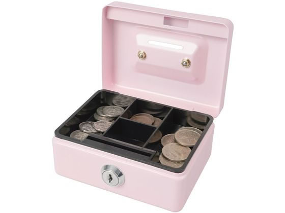 【商品説明】丈夫なスチール製手提げ金庫です。 貯金箱、募金箱、料金箱と用途に応じて使い分け可能です。 上蓋には硬貨投入口がつき、施錠をしたまま硬貨が入れられます。 硬貨投入口から硬貨を入れるとトレー下に落ちる仕組みです。 トレー下は硬貨以外にも紙幣やクレジットカード、保険証、マイナンバーカードなど収納できます。 底面にはネジ止め用の穴があいているので設置場所に固定でき盗難を防止します。【仕様】●サイズ:外寸/幅125×奥行101×高さ60mm、内寸/幅123×奥行93×高さ24mm●質量:430g●色:ピンク●材質:金属、プラスチック●施錠方式:シリンダー錠●収納サイズ:A7サイズ●硬貨投入口●ネジ穴付き(底面2箇所)●付属品:鍵2個●注文単位:1個 5offcp_09