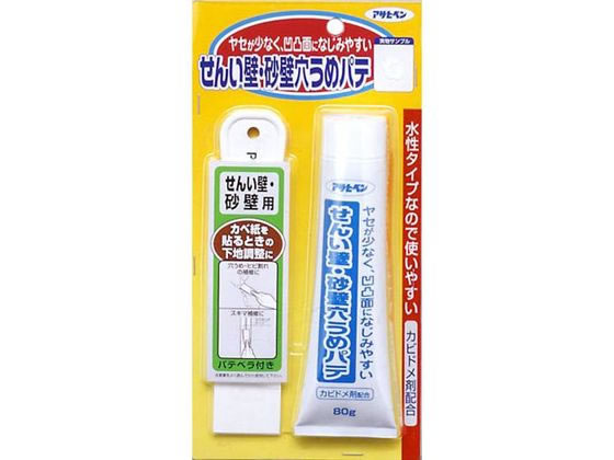 【商品説明】●凹凸面になじみやすいので、せんい壁・砂壁にカベ紙を貼るとき、穴うめやヒビ割れ・スキマなどの補修に適しています。●速乾性で、取り扱いやすい水性タイプです。【用途】●せんい壁、砂壁の補修に。【仕様】●内容量:80g ●色:ホワイト●重量:220g●材質:合成樹脂、中空粒子、カビドメ剤●使用面積の目安:約0.1m2●付属品:パテベラ